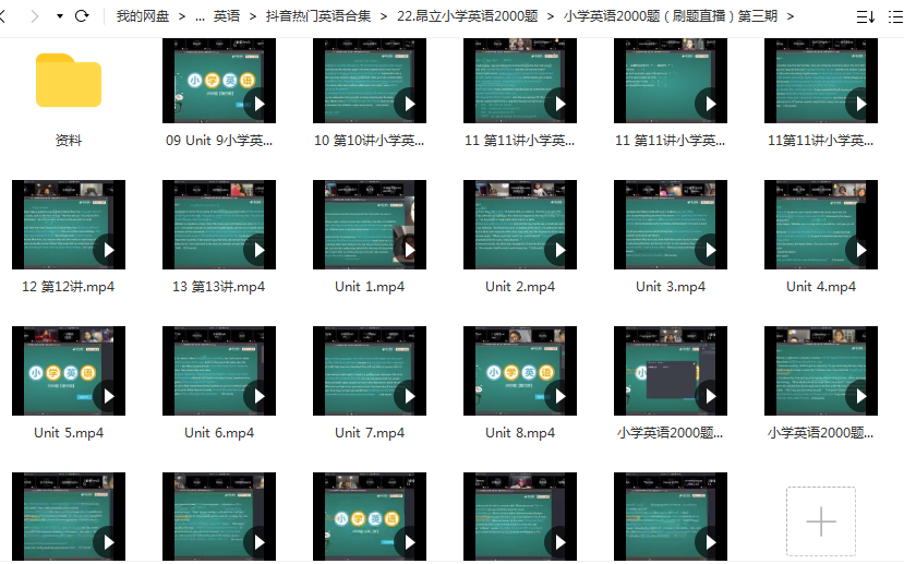 今天和大家分享的是昂立教育的《小学英语2000题》刷题直播视频课+讲义。 第一、二期知识包含语法与词汇,第三期知识包含阅读与完形。 想要精准提分,刷这类材料最适合不过了!资源一共8.77G百度网盘分享,里面包含题目及答案pdf文档可打印,及直播刷题视频,可对照了解学习巩固。