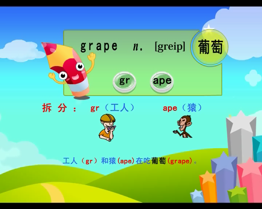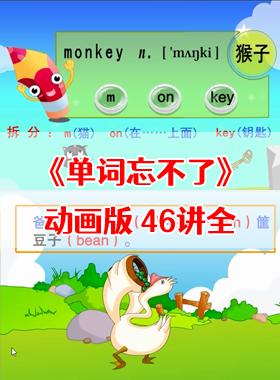 《单词忘不了》动画版教程全集共46讲,一个单词,一种记忆方法,只记动画,达到过目不忘的效果。破解右脑记忆密码,让你35小时,轻松记忆中小学英语单词。
