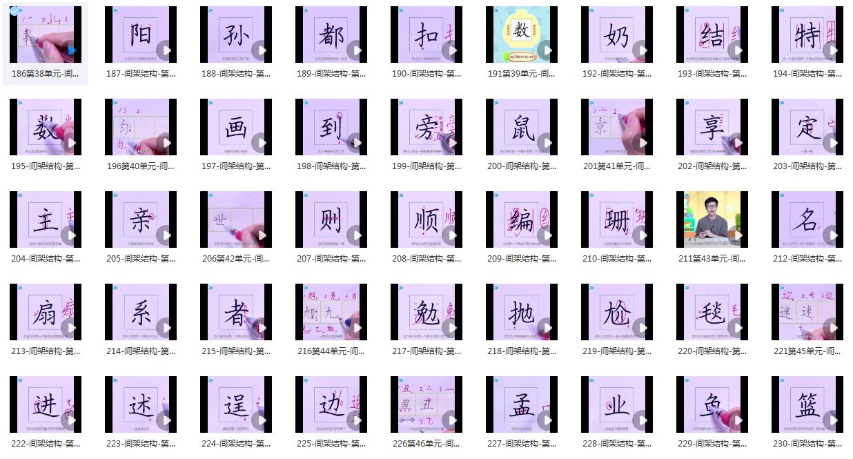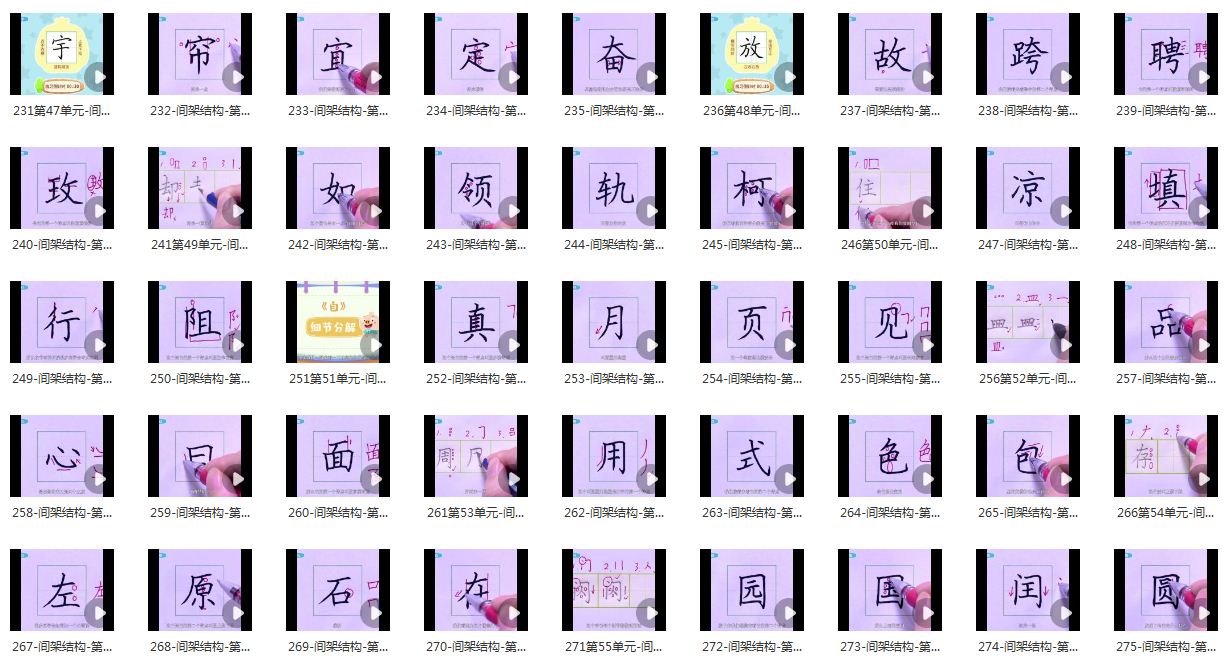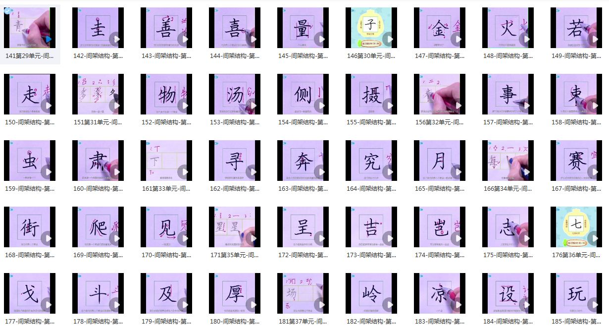 共56个单元:前28个单元是基础笔画+例字,后面的28个单元是间架结构+例字